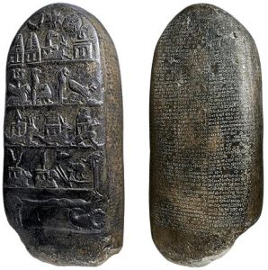 Llevado a Susa como botín de guerra en el siglo XII a. C y realizado en el periodo paleo-babilónico (siglo XIV a.C) con una dimensión de 68cm y una ornamentación a base de relieves tallados en la piedra caliza, esta estela se encuentra dividida en cinco fajas que acogen los símbolos de veinticuatro divinidades asociadas a la concesión realizada por el rey a su hijo el príncipe Marduk-aplaiddina (ya ves que ni tan siquiera la realeza se libraba de los trámites burocráticos, pues toda propiedad era libre de ser colonizada).