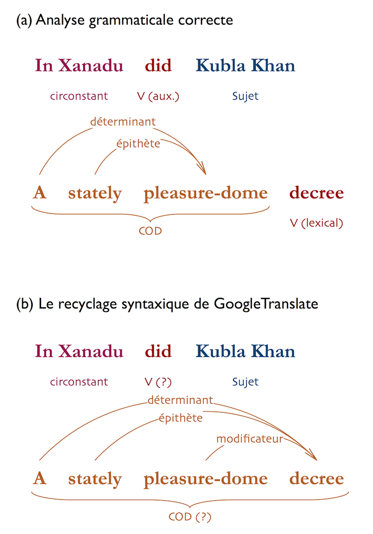 À partir de là, GT procède à ce qu’on pourrait appeler un recyclage syntaxique : l’IA essaie de faire sens des différents groupes de la phrase et les réorganise dans une nouvelle analyse grammaticale, pour finir par proposer le segment « un décret majestueux sur le dôme de plaisir ». Dans cette analyse, « a stately pleasure-dome decree » est un grand groupe nominal, où l’article indéfini « a » et l’épithète « stately » seraient incidents à « decree », et où « pleasure-dome » serait un substantif modificateur (noun modifier) lui aussi incident à « decree ».