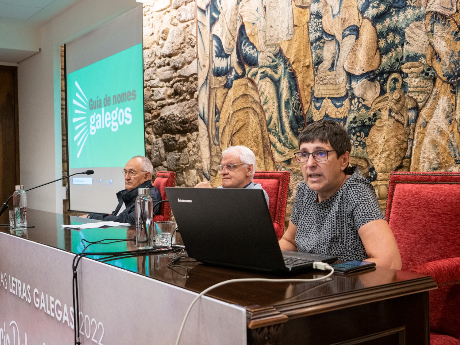 Ana Boullón, o coordinador do Seminario de Onomástica, Antón Santamarina, e o presidente da Academia, Víctor F. Freixanes, presentaron esta mañá na sede da institución este novo recurso. “Con el a Academia culmina un proceso que responde a unha demanda que dende hai tempo viñan facendo os nosos usuarios: unha guía de nomes actualizada, documentada, que serve de orientación para pais e nais que queren para os seus fillos e fillas nomes propios da nosa cultura, da nosa tradición e da nosa memoria histórica. Un servizo máis da RAG á sociedade galega”, salienta o presidente.