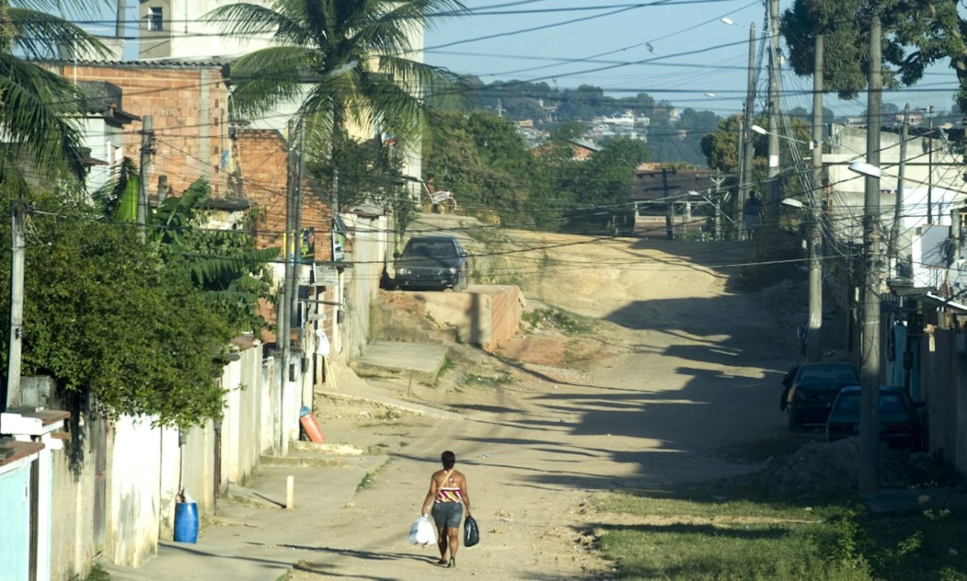 Une femme marche le long d’une rue en terre battue dans la zone suburbaine de Rio de Janeiro, au Brésil, une ville qui se caractérise par de fortes inégalités sociales.